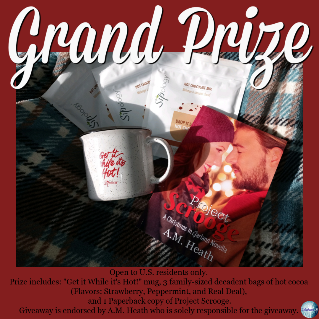 To celebrate her tour, A.M. is giving away the grand prize package of a paperback copy of Project Scrooge, 1 mug, 3 family sized bags of hot chocolate: Peppermint, Real Deal, and Strawberry!!