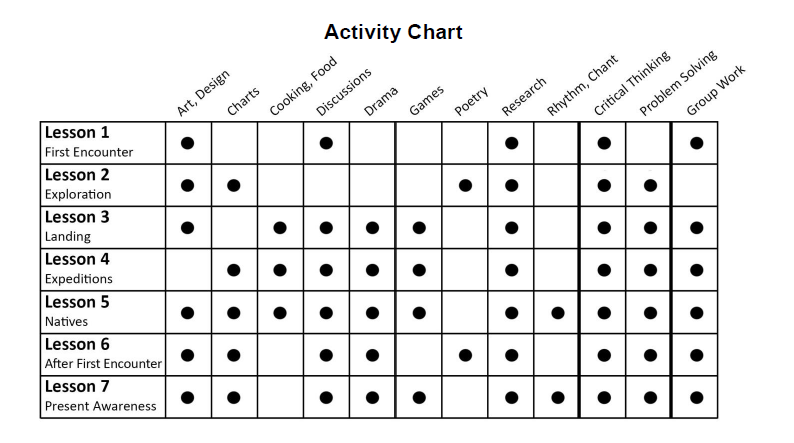Each lesson consists of objectives, background information, and the story broken into different headings. The first lesson also included a small section of people terms. There is then a list of activities which include the types in the chart above. And then there is a list of research topics.