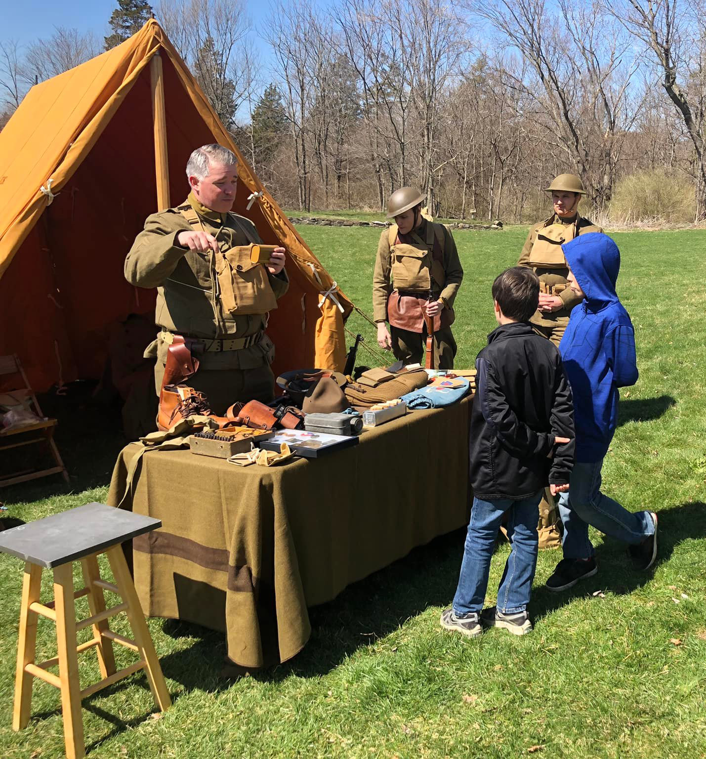 On certain days during the year, the museum hosts living history encampments or special educational programs. On the day we visited, they had a World War I tent set up outside with men in uniforms from the period talking about what life was like for soldiers in World War I. Though the presentation was not set up to be geared for kids, it was full of interesting facts, and the boys enjoyed getting to handle some of the gear. The main presenter showed them how gas masks worked and explained how they made it even harder to see and hear what was happening in the fog of battle. Other living history days are kid-themed and include interactive, kid-friendly activities. We hope to visit again in the fall when the boys can learn about life on the home front of World War II.