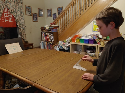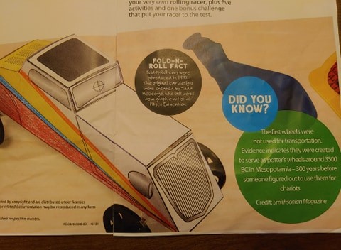 This activity includes all the materials that actually make the vehicles, though a hole punch is needed to create holes for the straw to go through, plus crayons or colored pencils are needed to decorate it before putting it together. A table knife is also used to score the lines to aid in folding. We were thrilled that there were enough materials for two children to each make one. And there were several templates to choose from.