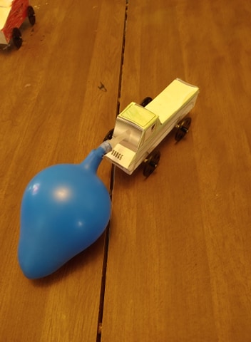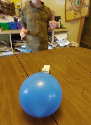 Unfortunately we had some more disappointment because the car design Harold used didn't seem to work with the balloon. I personally think the front window is too close to the front of the vehicle, so the balloon was touching the table.