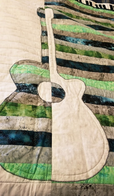 - strip (no, not that kind!) - This is my daughter's grad quilt, featuring her guitar portrayed in strip quilting. My mother was the creative quilter.