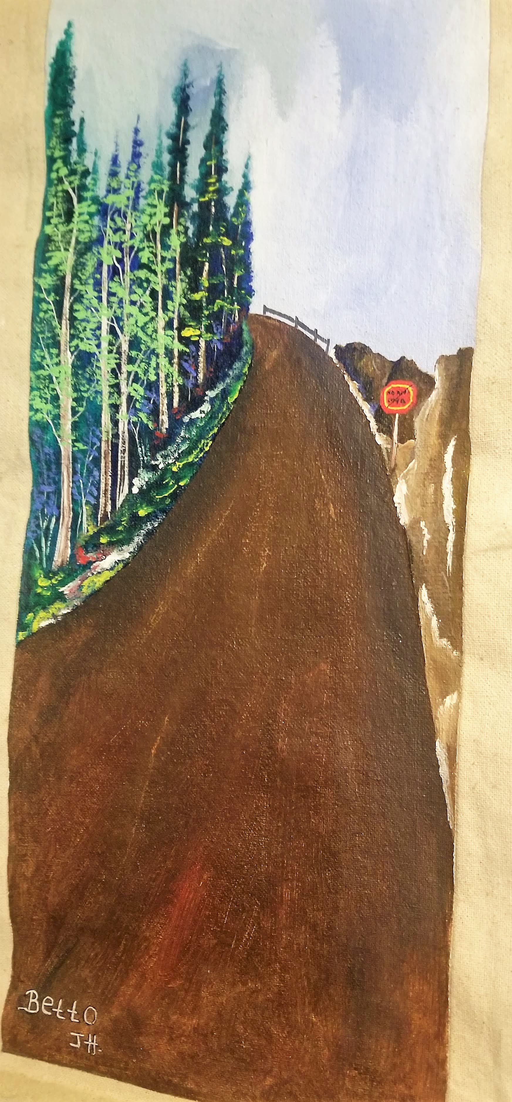 - road sign - Here's the prompt that I had trouble with! Turns out the only road sign that can be seen from my yard is just a bit too far down the road to show up in a photo. I was almost ready to give in and choose a photo from the past, when I remembered this painting. I purchased it from a Guatemalan missionary to Honduras when I was there years ago. And it does indeed feature a road sign in the scene.