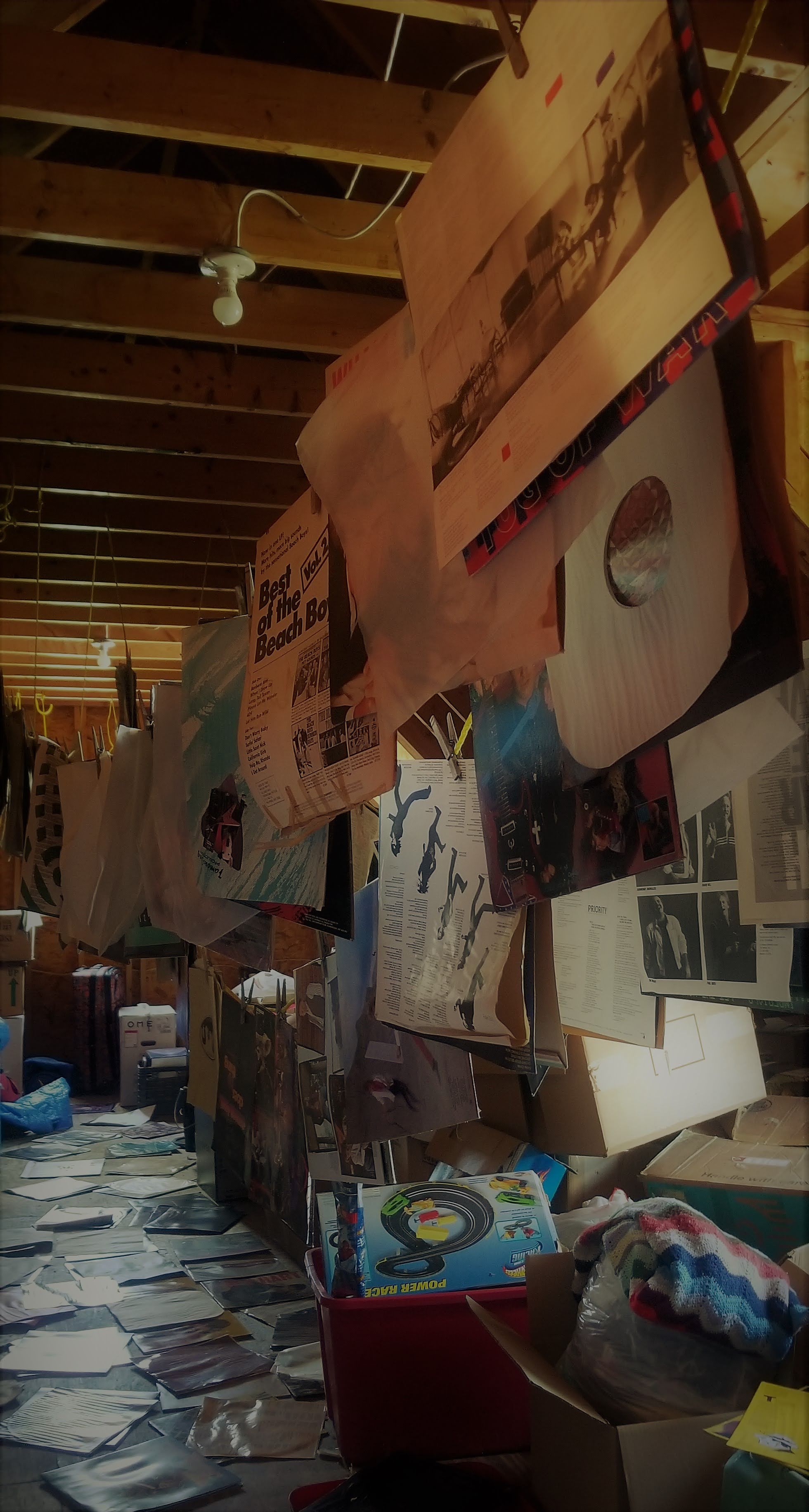 - clip - You can't see them very well, but all these record covers and sleeves are clipped to a makeshift clothesline in the second floor of our garage. Kennady and Dan rigged up this system to dry out the record covers.