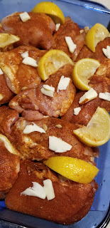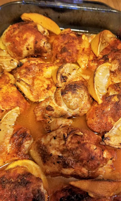 Slice one lemon into thin slices and place in the bottom of a greased baking dish. Slice another lemon into wedges. Mix up the spices (2 tsp paprika, 1 tsp cumin, 1 tsp oregano, 1/2 tsp cayenne, 1/2 tsp salt, 1/4 tsp cinnamon, 1/4 tsp ginger) and rub on 3 pounds worth of boneless chicken thighs. Put those on top of the sliced lemons. Squeeze the lemon wedges over the chicken and toss the wedges in there. Dot it all with little chunks of butter. Bake uncovered for about 45 minutes.
