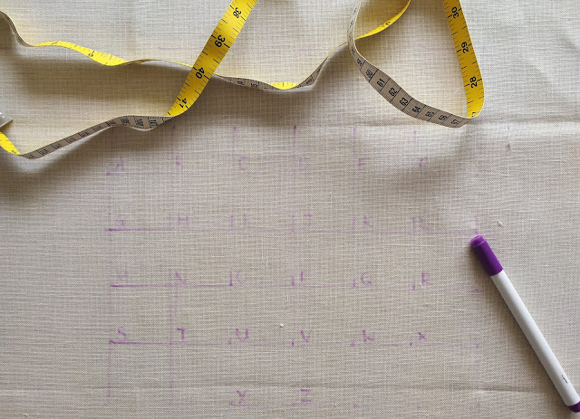 I began by dividing my piece of linen into a grid, making squares that were approximately 3 x 3 cm, and cross stitching on the letters. This isn't going to evolve as organically as a holiday diary - I am working with the alphabet here so it's already got some structure - but I don't necessarily know what I'm going to stitch for each letter yet.