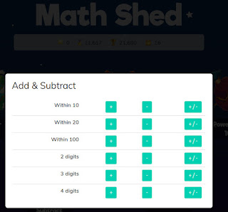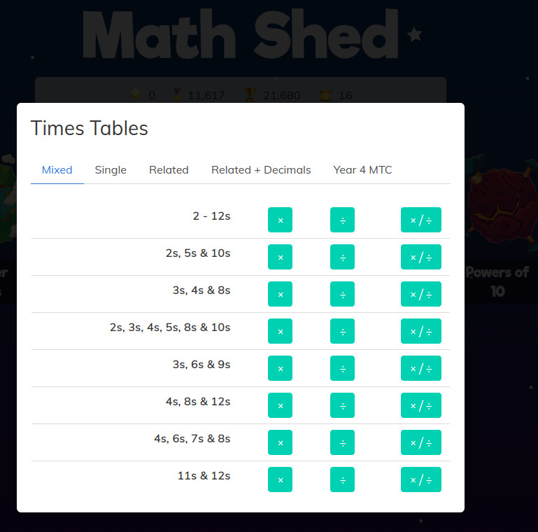 There are several games available in Math Shed for students to play: Number Bonds, Times Tables, Powers of 10, Add and Subtract, and More.