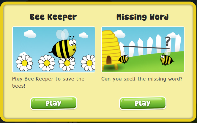 In Bee Keeper, students guess words by choosing letters - think hangman. You lose one bee for each incorrect letter guess. When you find a word you will get three bees back and earn a honey pot. The goal is to see how many words you can find before you completely run out of bees.