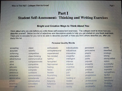 In this section, students are given writing exercises to help them discover who they are as a person and what type of student they are. They start this process by writing down 5 adjectives that describe them according to their mom, dad, sister, brother, friend, and self. Then they will write about 3 important events that have occurred during their life. They'll write about why these events were so important to them. They'll follow this up with making a list of their favorite things....bands, musicians, music, movies, television shows, books, video games (I'd cross this out and add a different topic for student that don't have one), three favorite memories, three people that have influenced them, favorite quotes, and favorite words. Students will then write about their student interests and write about their extracurricular activities they have done in and outside of school.