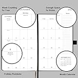 Monthly overview one month per two page spread with unruled daily blocks plus past current and four future month reference calendars pages measure 9 x 11 Professional design take charge of your schedule with classic style planner has a black premium simulated leather cover and twin wire binding to help keep pages secure for prolonged use