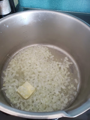 In a saucepan, melt the butter, and saute the onion, until it is translucent.